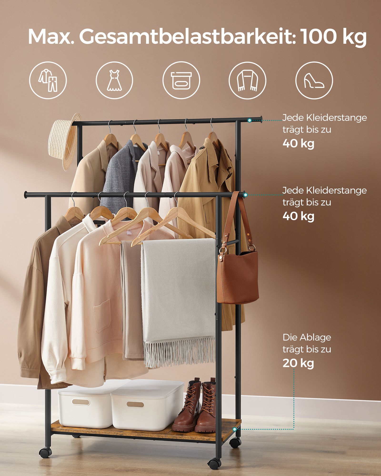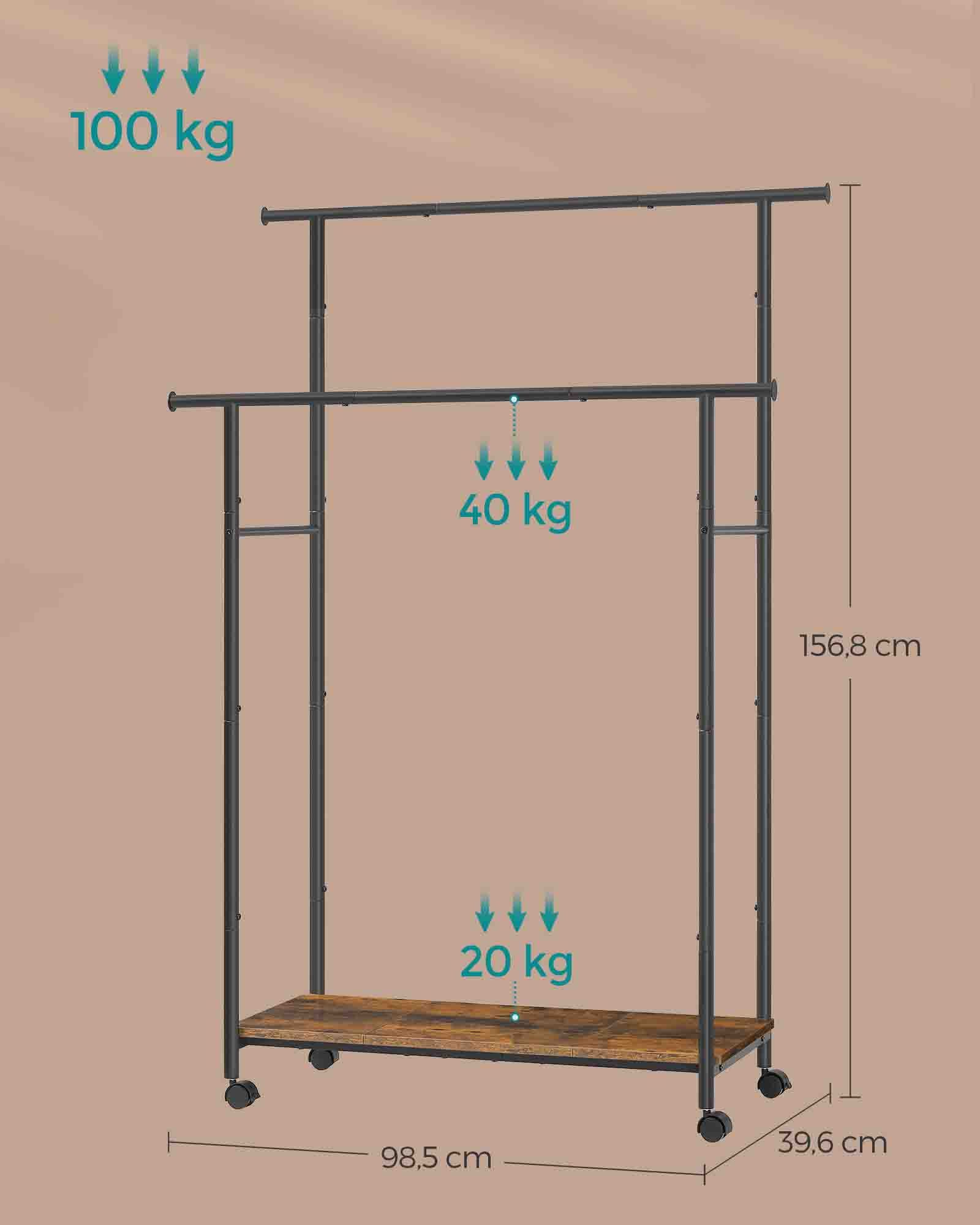 Tøjstativ på hjul med dobbelt bøjlestang og skohylde - garderobestativ med 2 robuste tøjstænger - bæreevne i alt 100 kg - rustik brun 98,5 x 39,6 x 156,8 cm