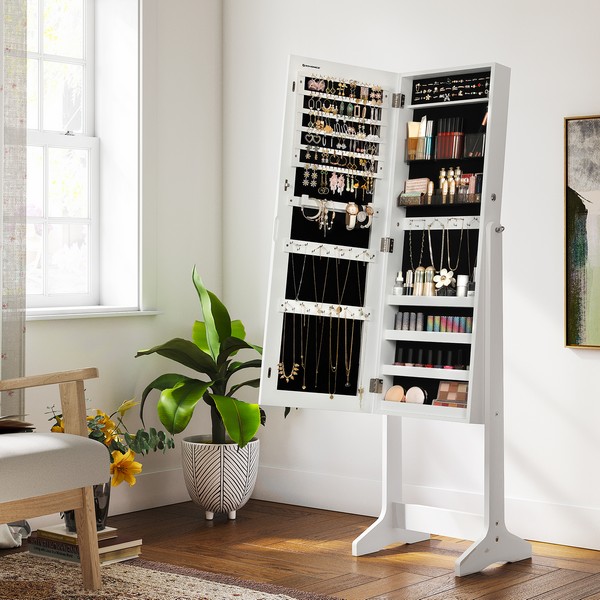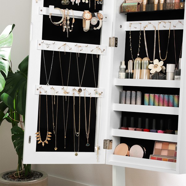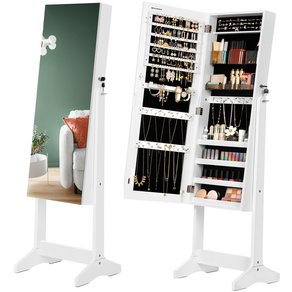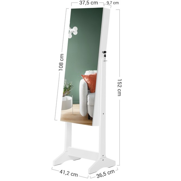 Med dette fritstående hvide spejlskab kan du beundre dig selv fra top til tå, i det store rammeløse spejl i fuld længde. Smykkeskabet afslører ikke kun din gode smag i mode, men valget af dette smykkeskab, ser også godt ud i dit værelse.