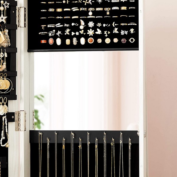 Spejlskabet stor kapacitet til at opbevare dine smykker i god orden. Organiser dine smykker og kosmetik gennem de forskellige rum, hylder og kroge (inkluderer 90 øreringe, 30 huller til ørestikker, 30 kroge til halskæder, 91 ring goldere, 5 opbevaringsrum og 1 opbevaringslomme.