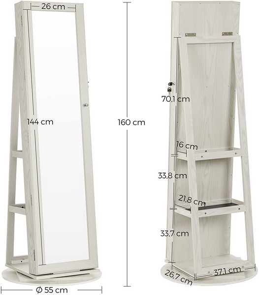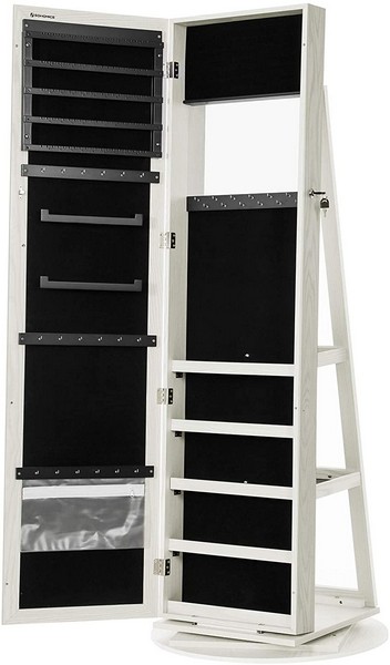 Hvidt drejeligt smykkeskab med opbevaringsplads og kroge til forskellige smykketyper. Inde i smykkeskabet har du plads til alle din makeup og dine smykker, så dine smykker og makeup er godt opbevaret og inden for rækkevidde.