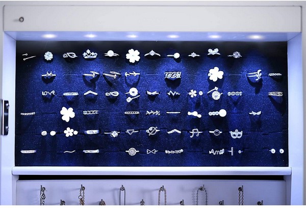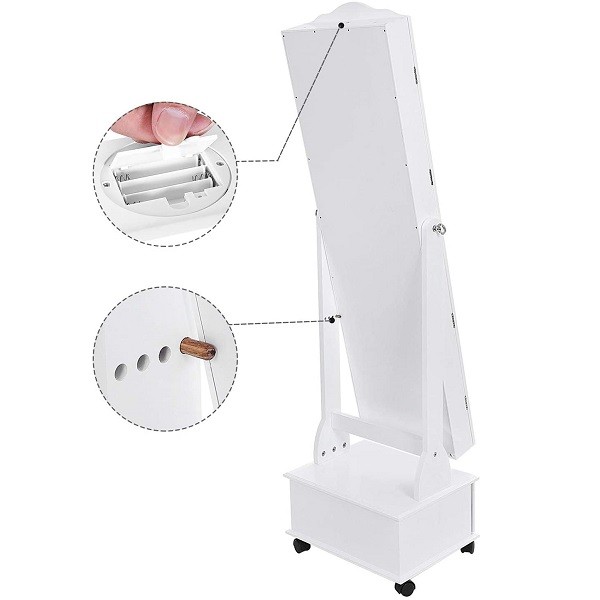 Med dette fritstående smykkeskab med låsebare hjul, stort spejl, LED lys øverst (til 3 AAA-batterier - medfølger ikke), 2 indre små skuffer, 1 ydre stor skuffe, hylder til makeup og masser af plads til øvrige smykker i skabet, vil dine smykker og makeup være godt organiseret og samlet ét sted, frem for dine smykker og makeup ligger spredt rundt i hjemmet.