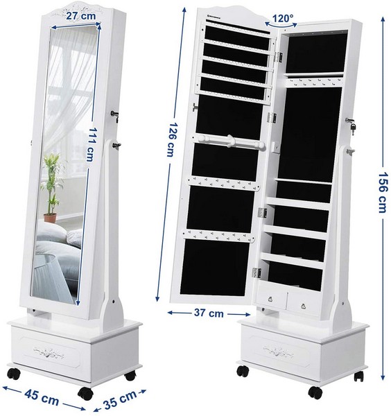 Med dette fritstående hvide spejlskab med LED lys, hylder, skuffer og låsebare hjul, kan du beundre dig selv fra top til tå, i skabets store indrammede spejl. Smykkeskabet afslører ikke kun din gode smag i mode, men valget af dette spejlskab, ser også godt ud i dit værelse.