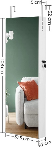 Smykkeskab - spejlskab med rammeløst spejl til smykker og makeup - væghængt skab til montering på væg eller dør - hvid 37,5 x 9,7 x 108 cm