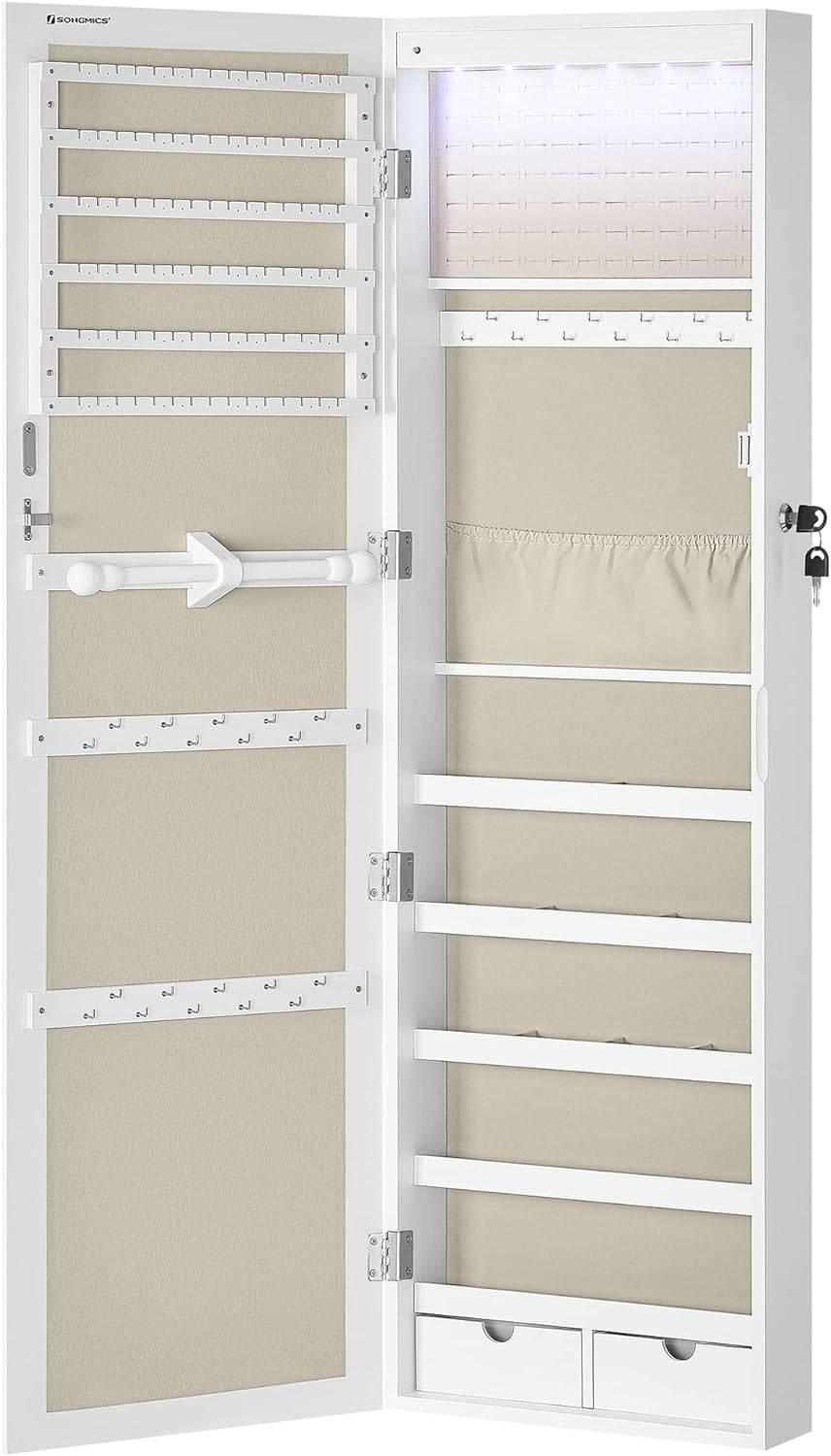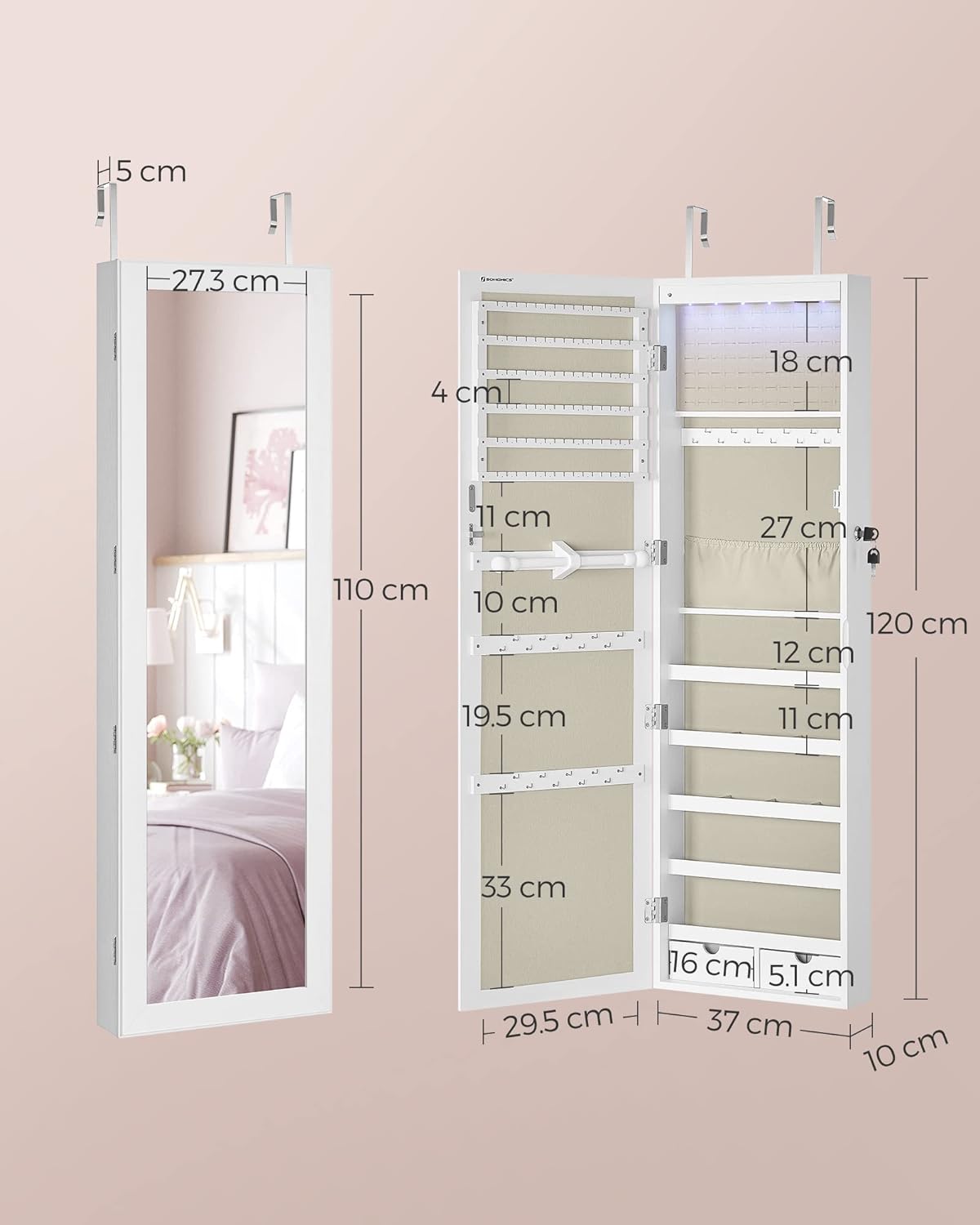 Væghængt hvidt spejlskab til smykker med LED-belysning (6 LED-lys drevet af 3 AAA/LR03-batterier (medfølger ikke)) fra toppen, som oplyser dine smykker, når du åbner døren på smykkeskabet, hvilket får dine smykker til at funkle og glitre.
