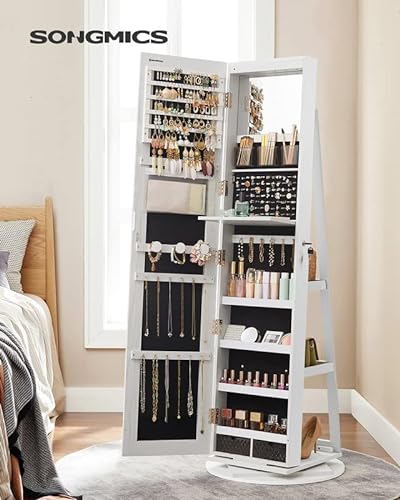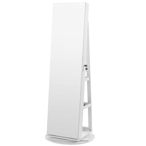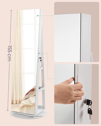 Hvidt smykkeskab på roterende fod med rammeløst spejl. Dette smykkeskab har et 37x155 cm rammeløst helkropsspejl, så du kan beundre dit outfit fra top til bund i spejlet.