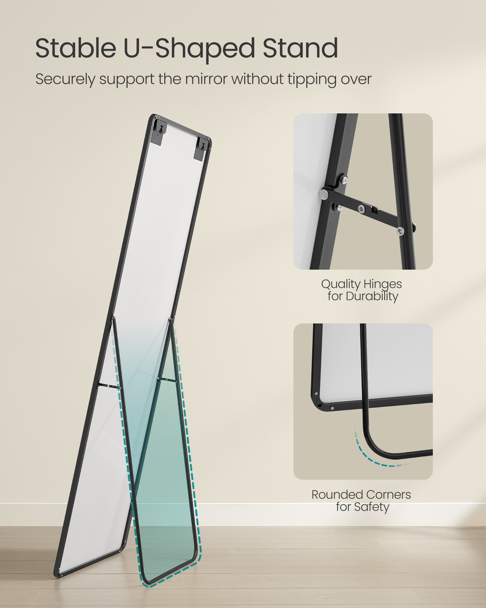 Stående stabilitet: Sørg for, at stativet er helt åbent for at holde gulvspejlet stabilt. Tag spejlet i fuld længde forsigtigt ud af pakken for at undgå skader.