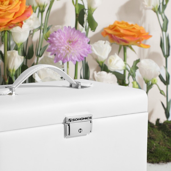 Smykkeskrin i kunstlæder inkl. rejseskrin - skrin til smykker inkl. rejseudgave - hvid med skuffer, sidelåger, spejl og lås til smykker, ure osv.