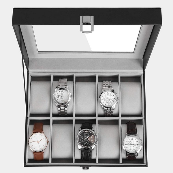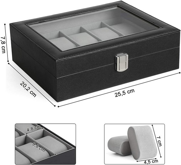Displayæsken er skræddersyet til 10 ure, med fløjlsforing giver en perfekt plads til dine elskede ure, holder urene korrekt opbevaret og beskytter dem mod støv, hakker og ridser.