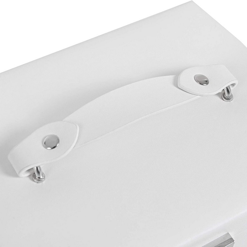Smykkeskrin i kunstlæder - skrin til smykker - hvid med skuffer, sidelåger, spejl og lås til smykker, ure osv.