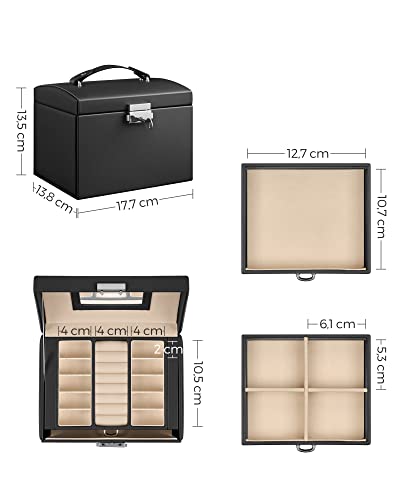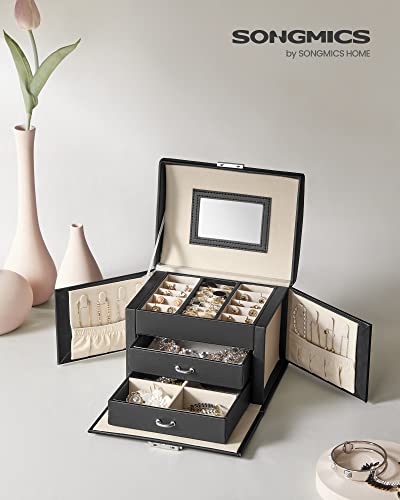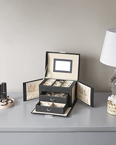 Smykkeskrin i kunstlæder - skrin til smykker - sort med skuffer, sidelåger, spejl og lås til smykker, ure osv.