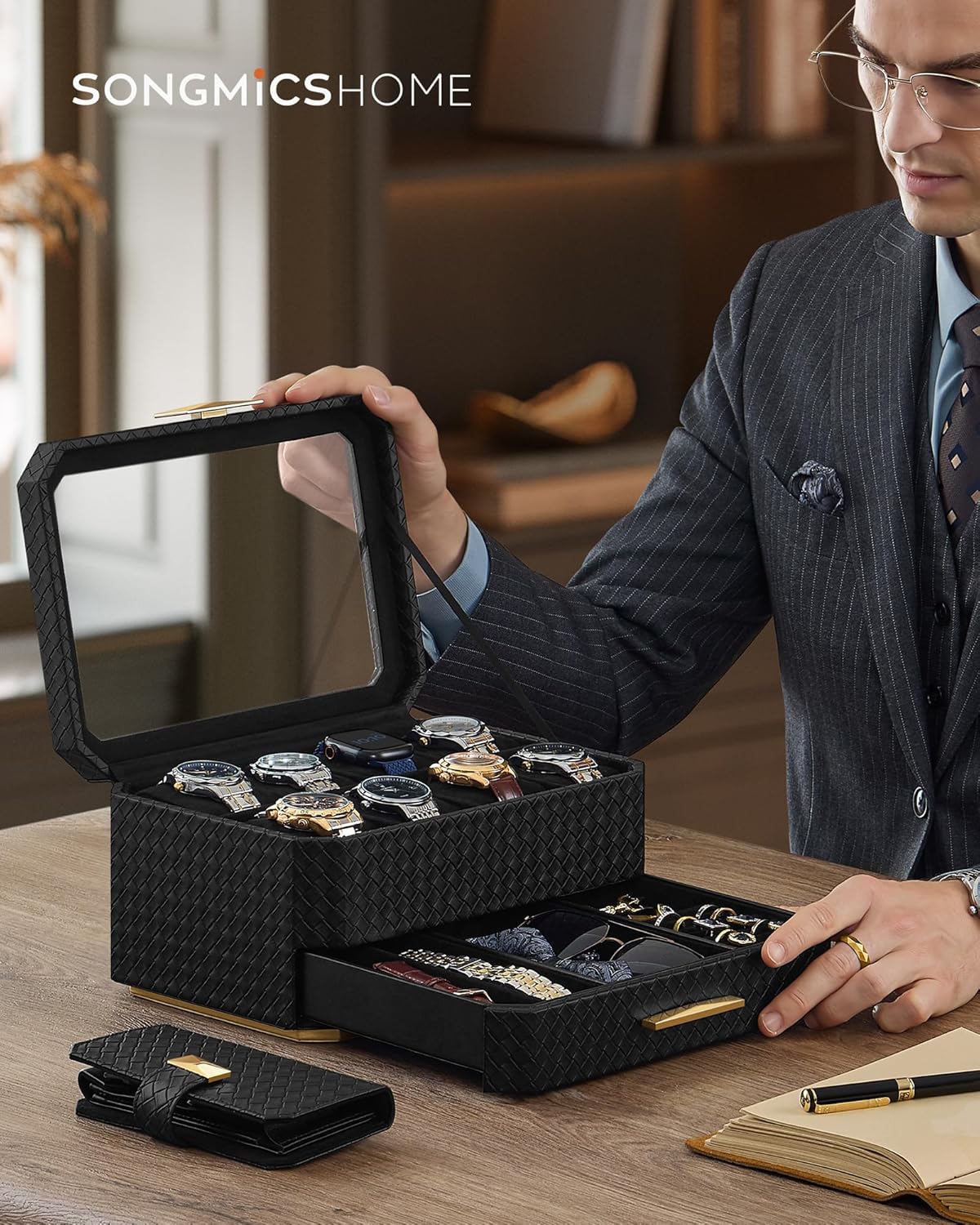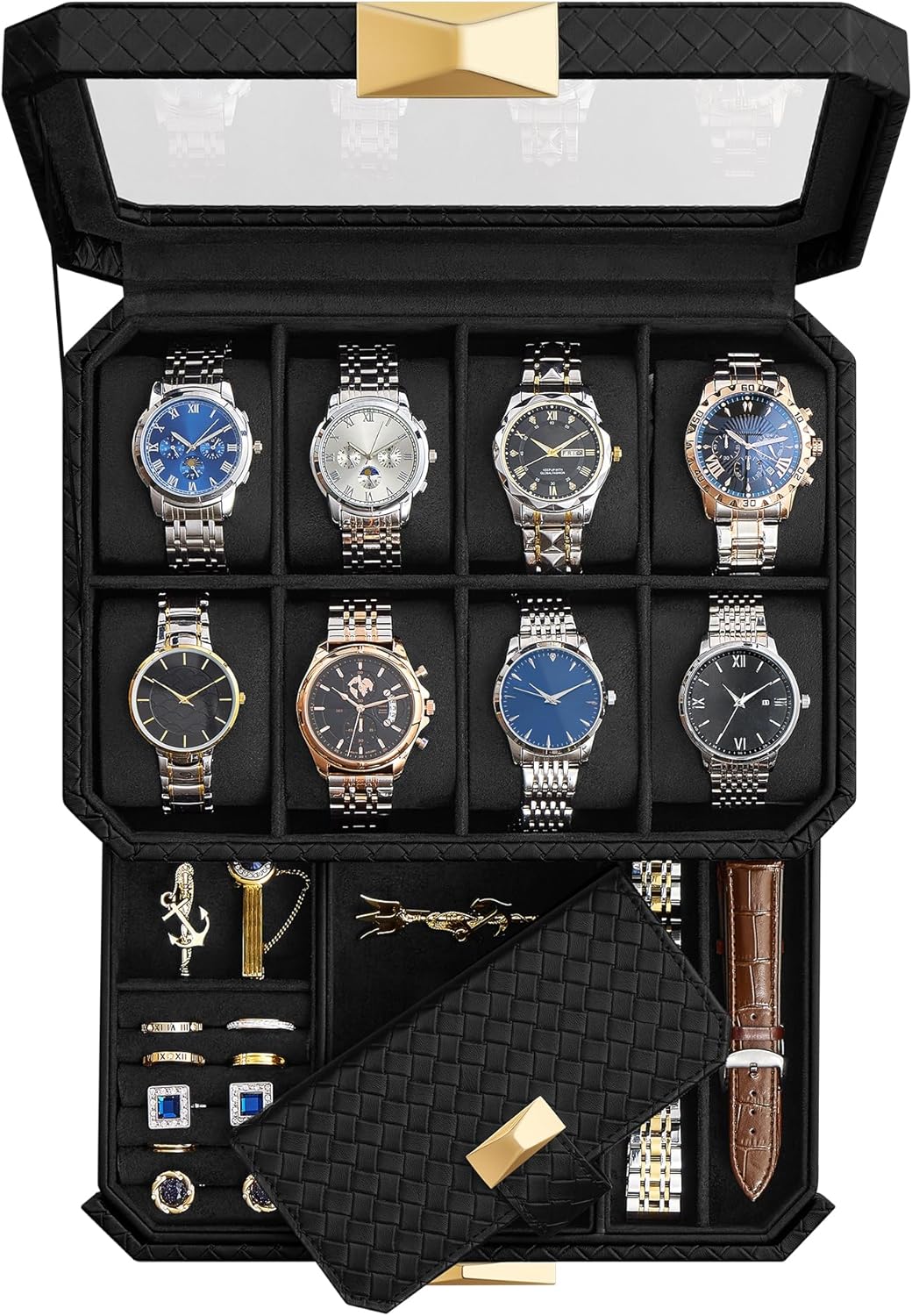 Urkasse i kunstlæder - 2-lags urboks til 8 ure med skuffe og rejseetui - displayæske med glasvindue - sort