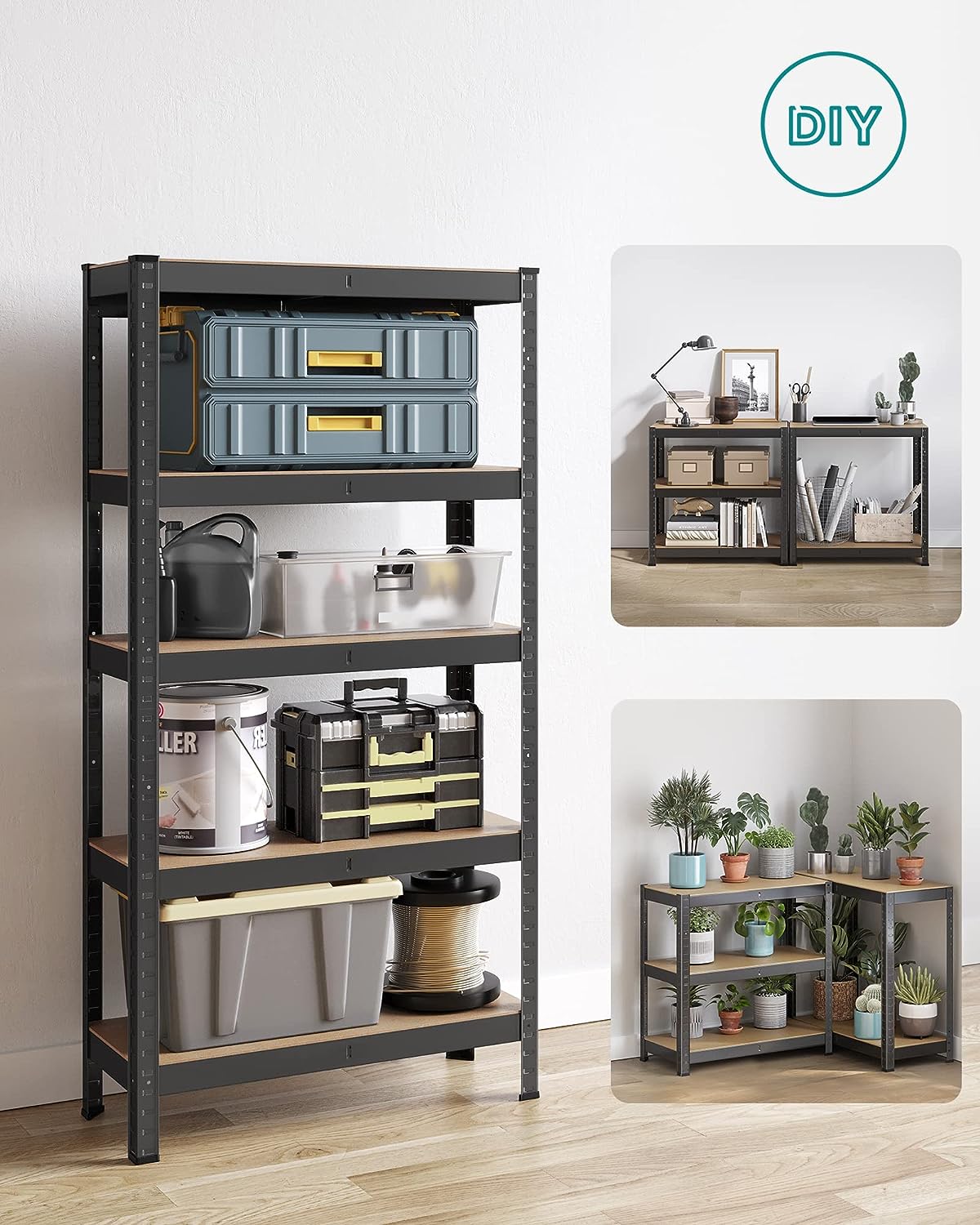 En værkstedsreol i stål med god og sikker opbevaring behøver ikke at se kedeligt ud. Denne delbare lagerreol i industrielt design stil, kombinerer en sort ramme med flotte brune træhylder.