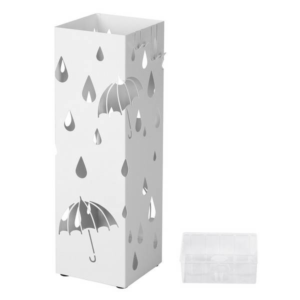 Paraplystativ - firkantet hvid paraplyholder med motiver, kroge og drypbakke