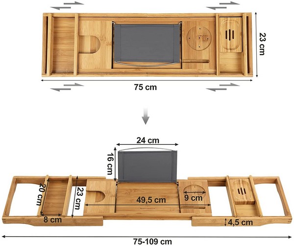 Denne bambus bakke kan udviddes så den passer til de fleste badekar. Træk blot i enderne af denne udtrækkelige badekarshylde for at udvidde fra 75 cm til 109 cm, så badekarsbakken passer til dit badekar. Det er især nyttigt med en udtrækkelig badekarshylde, hvis du har mere end én størrelse badekar eller senere skal opgraderer til et nyt.