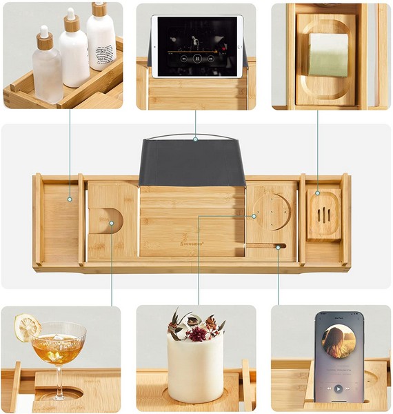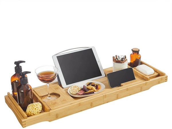 Kan du lide at læse eller se programmer, mens du tager et bad? Eller mangler du bare et sted til et glas vin? Så er denne bambus badekarshylde specielt designet til dig.