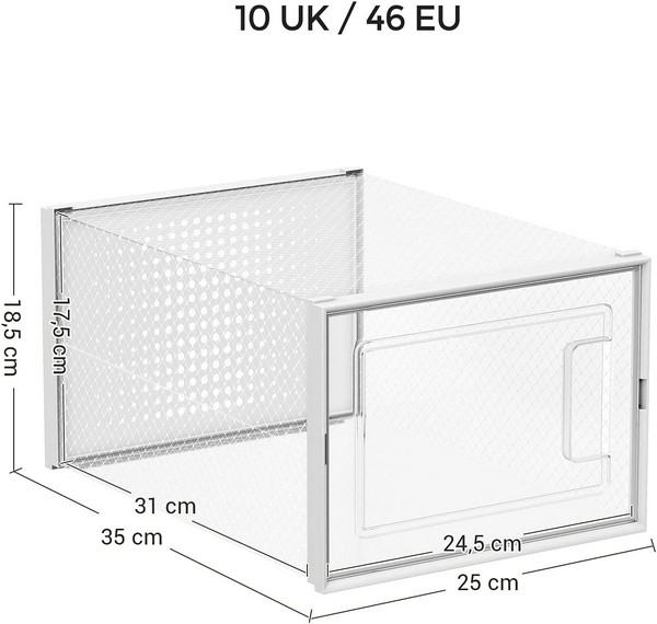 18 stk alsidige stabelbare opbevaringsbokse. De 18 kasser til opbevaring har samme størrelse og stables nemt. Skokasserne kan anvendes til andet end sko. Indvendige mål: 31 x 24,5 x 17,5 cm (L x B x H), som er store nok til at opbevare de fleste typer sko.