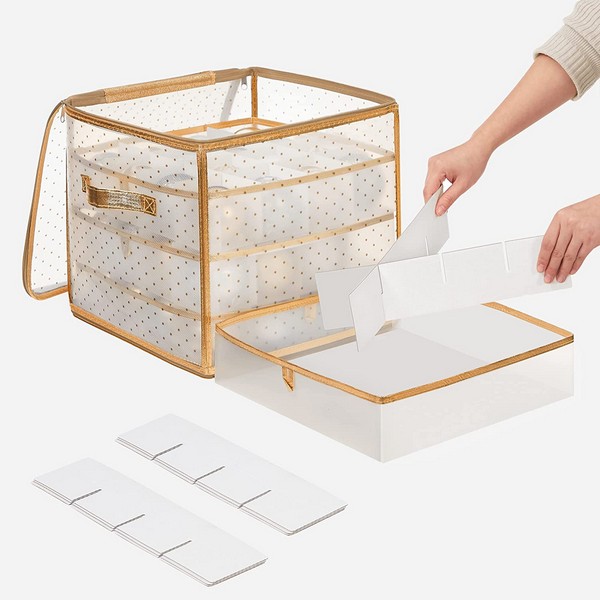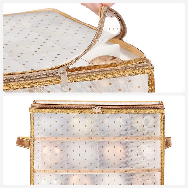 Med disse 2 opbevaringstasker med 128 opbevaringsrum, holdes dit julepynt af glaskugler opbevaret i beskyttende rum det meste af året og dine glaskugler beskyttes mod at gå i stykker. Du kan se dine gemte julekugler, inde gennem de semi-transparente tasker med dekorativ gylden kant.