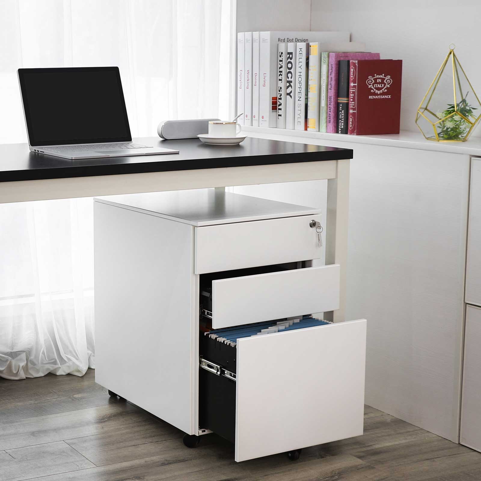 Alt på ét sted: Flyder dit skrivebord med bunker af papirer? Dette hvide mobile arkivskab på 39 x 52 x 60 cm fylder ikke meget, men løser udfordringen med bunker af papirer. Med arkivskabets 3 skuffer har du nemt plads til dine papirer og låsen på den øverste skuffe forbedrer sikkerheden.