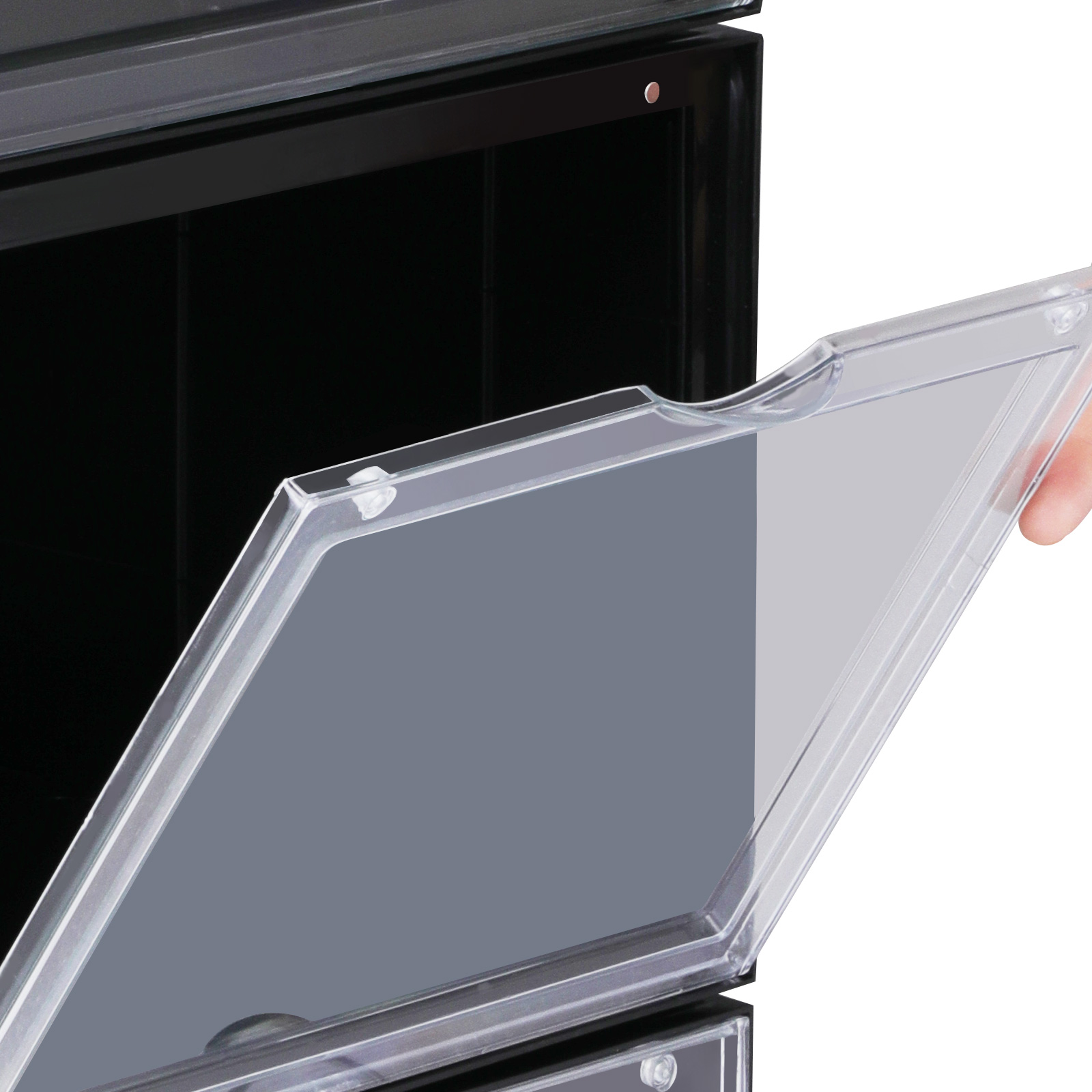Støvtætte opbevaringsbokse til f.eks. sko. Sorte stabelbare skoæsker med gennemsigtige låger.