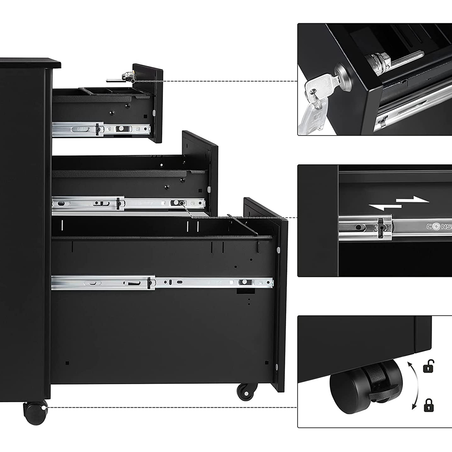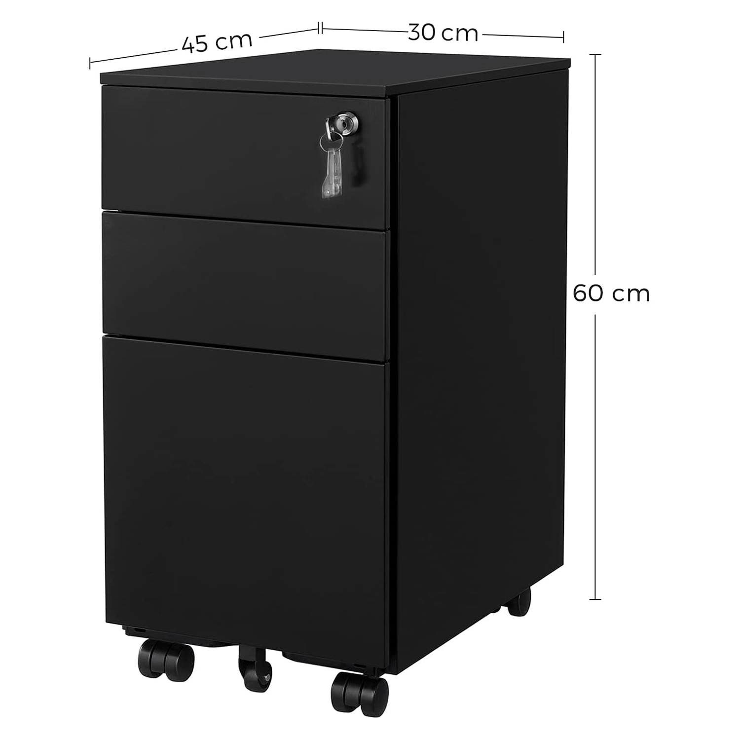Arkivskab på hjul, med lås og 3 skuffer - mobilt arkivskab med skuffe til hængemapper - sort 30 x 45 x 60 cm