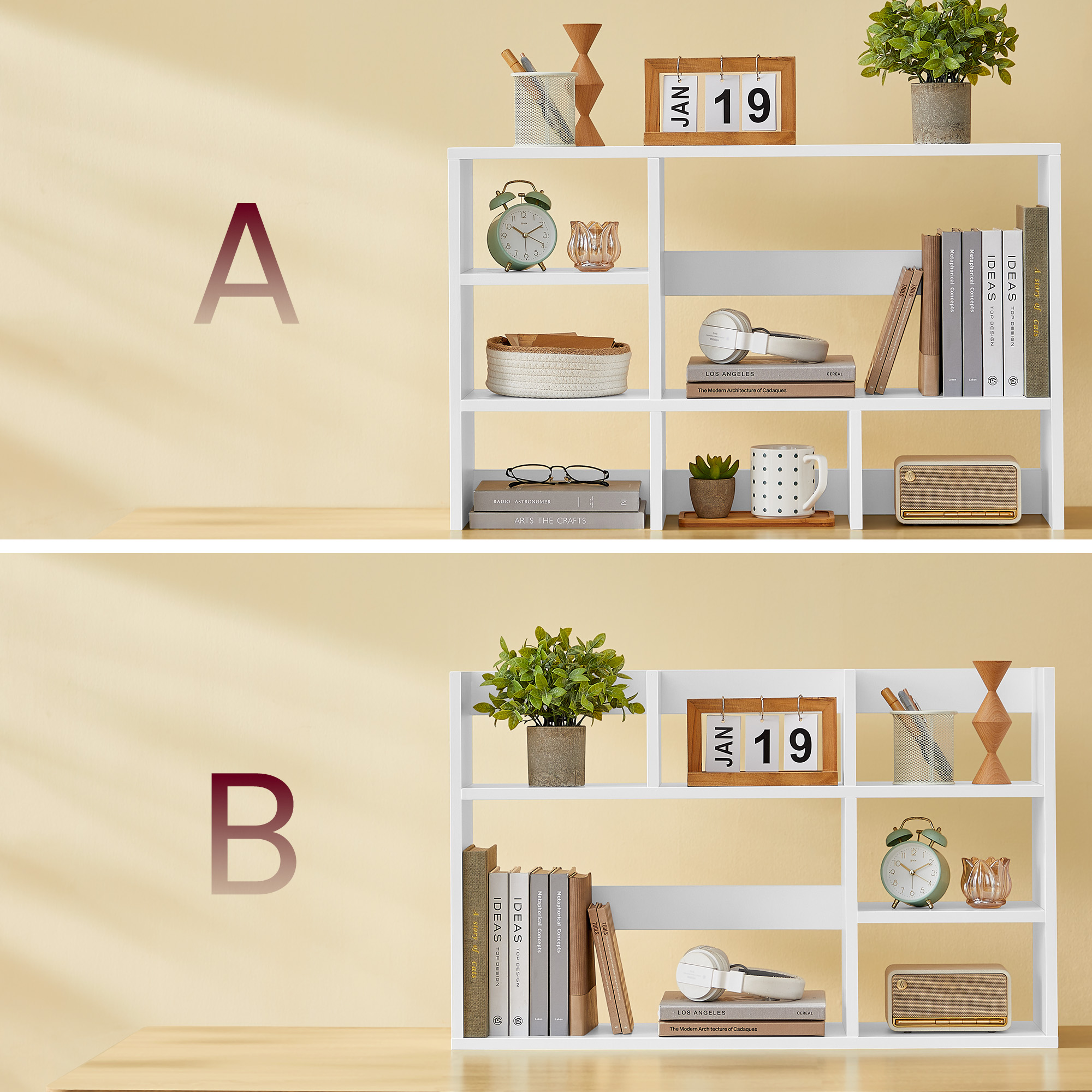 Moderne og stilfuldt skrivebordshylde: Denne hylde giver flere muligheder for at fremvise din stil. Med et enkelt, stilfuldt design med ensartede farver kan den tilføje et strejf af modernitet til dit skrivebord.
