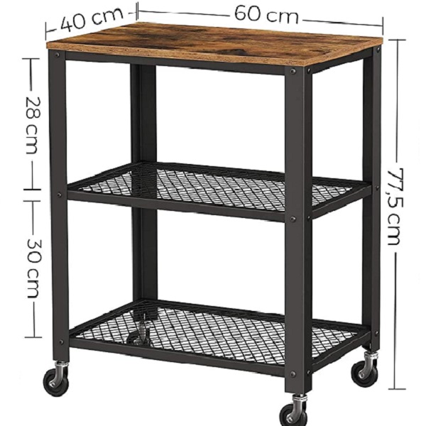Rustik brun rullebord i industrielt design med 4 hjul og 3 hylder til opbevaring og servering. Køkkenvognen med 3 hylder kan anvendes til opbevaring i køkkenet eller som serveringsvogn.