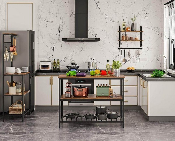 Således får du en køkkenø med 3 hylder, heraf en stor bordplade, som udgør et ideelt sted at organisere dine sauceflasker, krydderiglas og mikrobølgeovn.