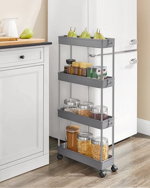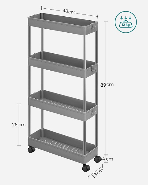 Opbevaringsvognen er smal, dybt og høj, så ting nemt kan opbevares i køkkenvognens 4 hylder.