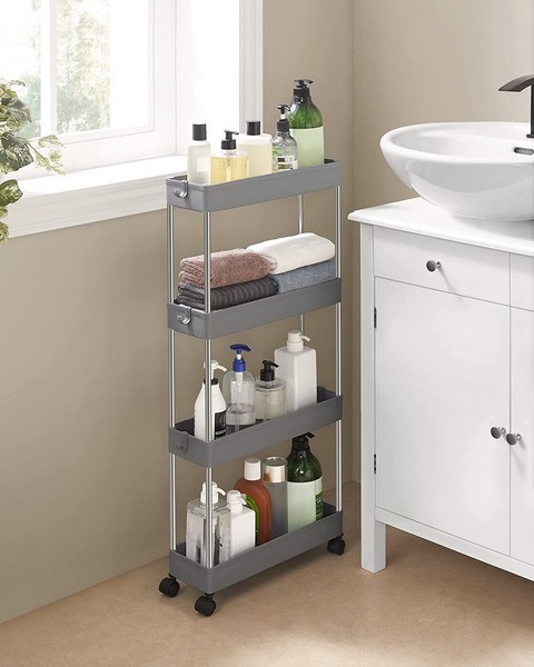 Alsidig rullevogn. Den grå finish gør køkkenvognen kompatibel med de fleste indretningsstile. Du kan placere denne opbevaringsvogn i dit køkken til opbevaring af krydderiglas, dåser, eller stille den i dit badeværelse for at opbevare shampoo, sæber, håndklæder eller på dit toilet for at opbevare toiletpapir og deodoranter.