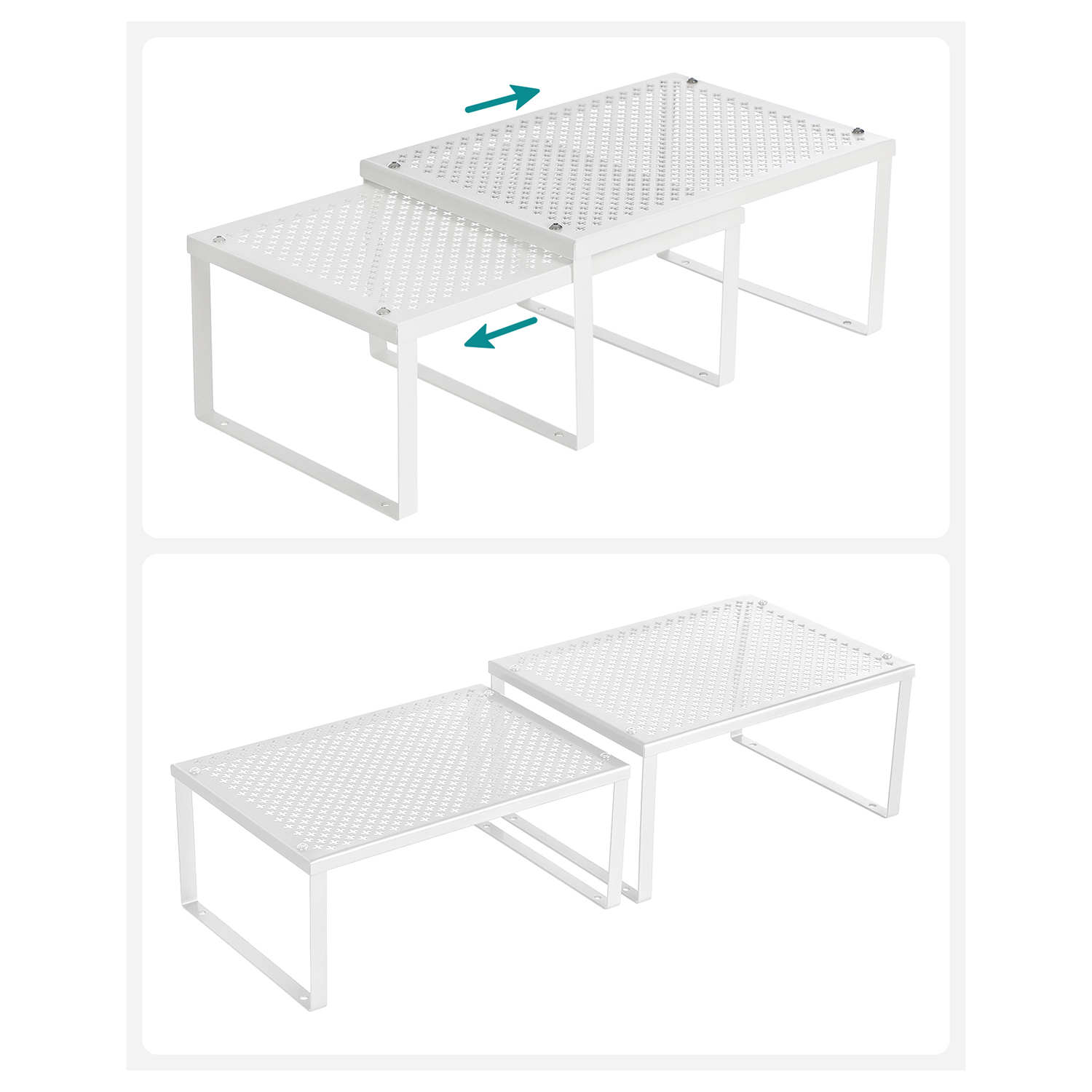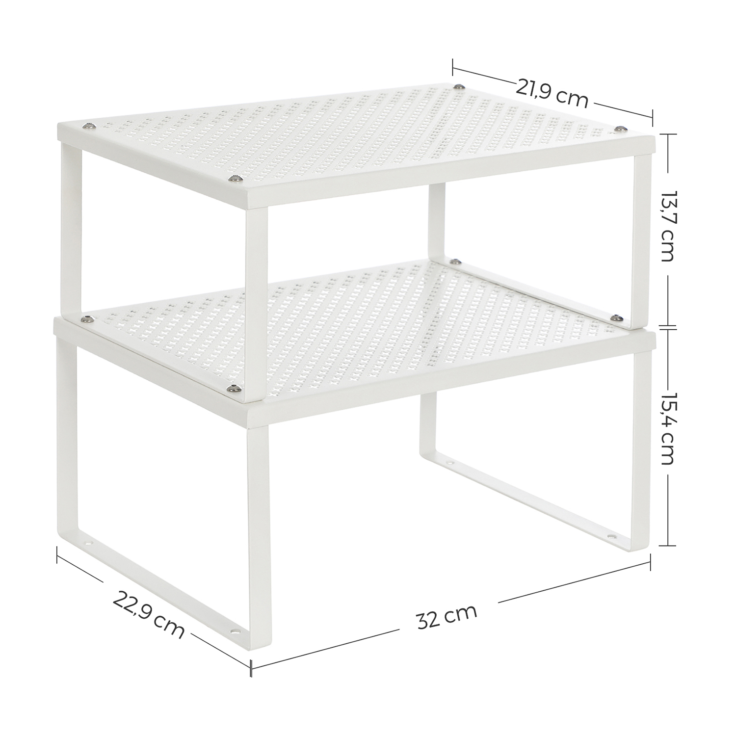 Med dette sæt får du 2 robuste stabelbare køkkenhylder i hvid metal og udvideligt design, nem montering og en vidunderlig måde at holde orden.