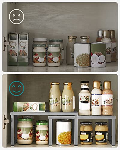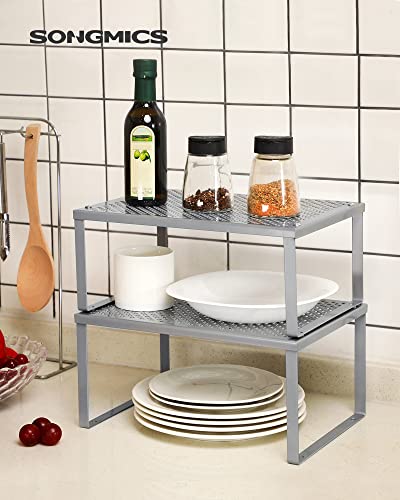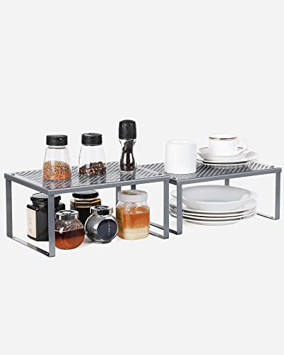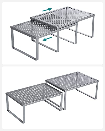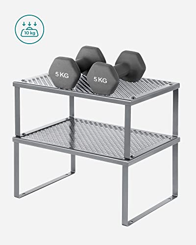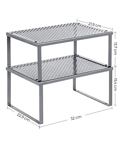 Med dette sæt får du 2 robuste stabelbare køkkenhylder i grå metal og udvideligt design, nem montering og en vidunderlig måde at holde orden.